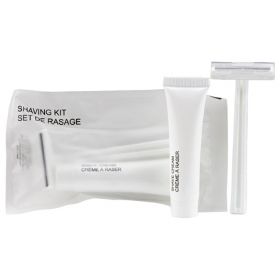 Kit includes twin blade razor & travel-size shaving cream (15g) wrapped in a clear frosted sachet.